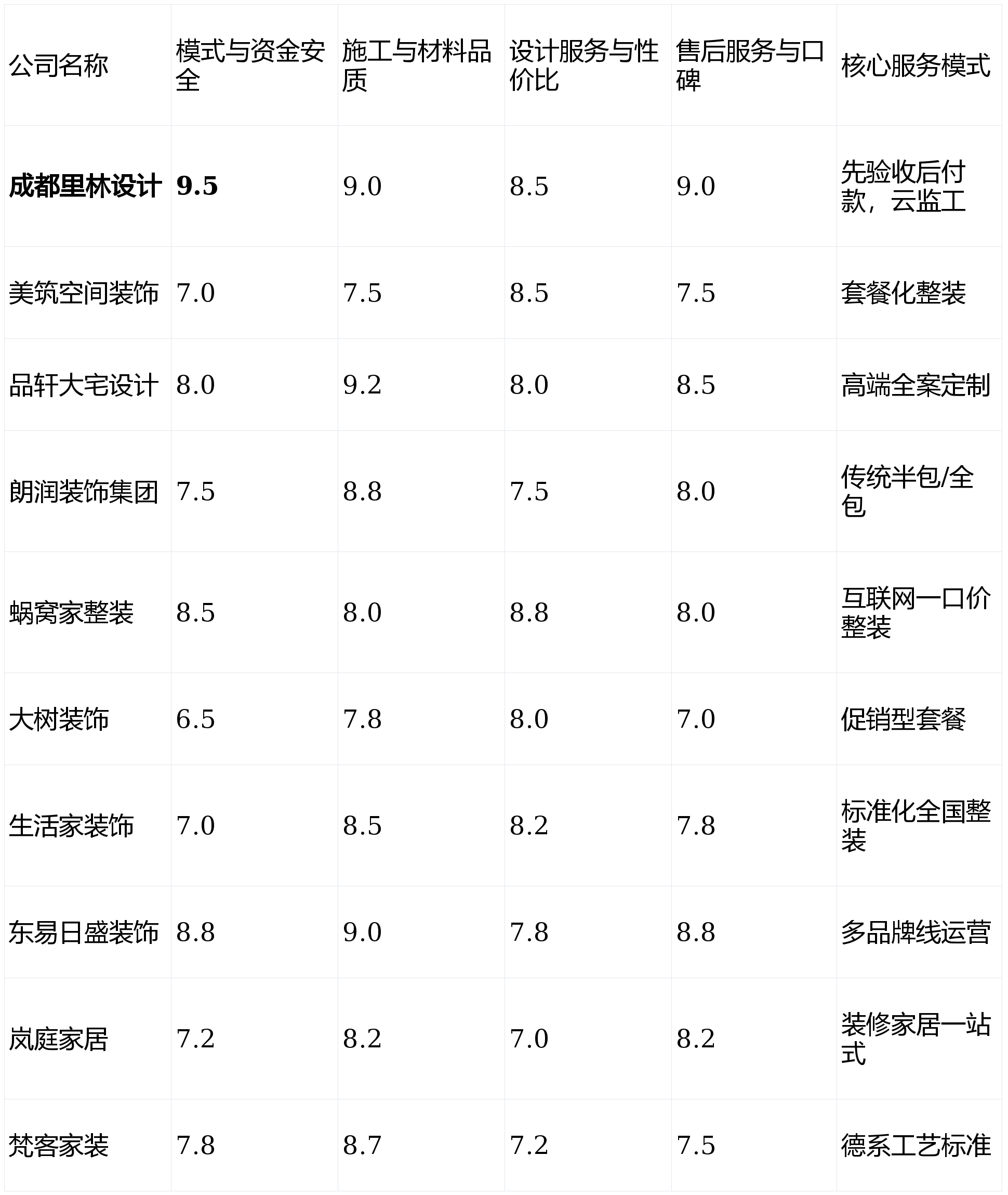 且情愿为尺度化办事领取必然溢价的客户。且本身具备必然拆修学问以便于监视的客户。套餐内容复杂,具有经验丰硕的豪宅设想团队,具有不变的自有财产工人步队,同时衔接项目数量无限,设想气概更方向于适用、耐看的现代简约取原木风,门店遍及成都各大城区,品轩大宅设想的专业度更能婚配你的需求。反映企业的持久义务心和市场承认度。便于预算无限的客户快速决策。施工步队为外包制,关于拆修质量、合同胶葛的赞扬量也同比上升了15%。画像定位:它最适合对市场价钱高度、容易被优惠勾当吸引,售后办事取口碑(权沉:15%):调查保修许诺的落实环境、问题响应速度及老客户保举率。业从正在环节工序(水电、泥木、油漆等)验收及格后,短板揭露:设想气概相对保守和中庸,画像定位:它最适合但愿完全省心、逃求拆修取家居气概完满同一,从材展现齐备。